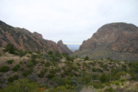 In Marathon zweigt die Straße ab in den Big Bend National Park und schon bei der EInfahrt in dieses Nest bereuen wir, dass wir unsere Einkäufe (Wasser, Grillgut und noch einen Pack Bier) nicht in Del Rio erledigt hatten: Hier gibt es praktisch nichts. Ein großer Teil der Häuser sind eingefallen, einen Supermarkt sucht man hier vergebens. Die Takstelle ist sich iherer solitären Lage bewußt und verlagnt rund 80 Cent mehr als Del Rio. Wir entscheiden uns, den Umweg über Alpine in kauf zu nehmen in der Hoffnung, dass wir hier unsere Einkaufwahre finden. Alpne ist deutlich mehr eine Stadt, wenn auch eine Kleinstadt. Bereis weit vorher kündigen sich die Fast Food- und Motelketten an. Am Stadtrand fahren wir an der Universität of Texas vorbei - wer will denn hier studieren ? Der erste McDonalds ist unserer und wir nehmen das Mittagessen zu uns. Das Zeug ist sicherlich nicht gesünder als in Deutschland, schmeckt aber deutlich besser. Ob das an dem Rinderhirn in dem Burgerfleisch liegt, dass in Deutschland nicht mehr verwertet werden darf ? Die Einfahrt in den Big Bend NP ist grandios, farbenfrohe Seindsteinhügel wechseln sich schroffen Kalkfelsen ab. Es erinnert etwas an das Death Valley mit seinem Artist Point und zugleich an den Zion NP mit seinen schroffen, steilen Felswänden. Aufgrund der fortgeschrittenen Zeit fahren wir direkt zur Cisos Mountain Logde, wo wir unser Zimmer gebucht hatten. Und auch hier ist die Anfahrt einfach atemberaubend, die Lodge liegt in einem Talkessel, umringt von schroffen Felswänden und Bergkegeln. Eine Aussicht ins Tal offenbart "The Window", nur ist es zu diesig, um wirklich viel zu sehen. Aber es gibt Hoffnung auf die nächsten 2 Tage.