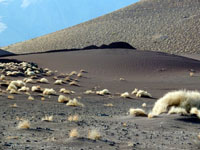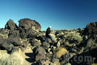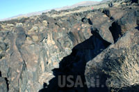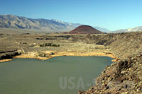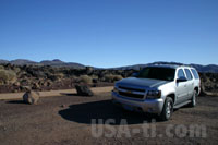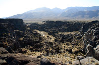 Die Fahrt durch das Owen Valley ist landschftlich sehr reizvoll. Das Tal ist auf West- und Ostseite von hohen Bergkämmen gesäumt, dazwischen die Ebene des Owens Valley. Wir machen einen Abstecher zu den Fossil Falls, einem Wasserfall, der sich in Lavagestein hineingefressen hat. Wasser fällt hier allerdings nur bei stärkerem Regen, und so waren wir auch ohne den Fall glücklich über das gesehene. Zu den Fossil Falls führt ein kurzer Trail durch das halb verwitterte Lavafeld, rießige schwarze Felsen stehen aus dem goldenen Gras heraus und bilden einen phantastischen Kotrast. Ein Kleinod, an dem die meisten Besucher unwissen vorüber rauschen. Leider nicht die Familie mit den 2 Autos und der Kinderschar, die uns direkt auf dem Trail gefolgt ist und neben der ein Militärjet als leichtes säuseln abgetan würde. So genießen wir den Anblick bei 130 dB nur kurz und fliehen alsbald zurück zum Auto.