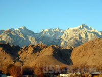 4. Tag: Von Lone Pine ins Death Valley Das Motel war ganz in Ordnung, nur leider konnten wir unser Fenster icht ganz schließen. Zum einen hatten wir die ganze nach frische Luft, zum anderen aber stürmte es die ganze Nacht und wir hatten komische Windgeräusche bei uns im Zimmer. Dazu kam noch, dass der Kühlschrank extrem laut war und ich ihn nicht abschalten konnte, und den Stecker habe ich im Halbschlaf in der Nacht nicht gefunden. Und so war um ca. 4 Uhr die Nacht zu Ende - was ich etwas zum schreiben genutzt habe. Das Frühstück war für Motels richtig gut, es gab Waffelteig in 2 unterschiedlichen Geschmacksrichtungen, Obst und ansonsten das Übliche. Der Raum war sauber und aufgeräumt und hat eine gigantische Aussicht auf die Felsen der Sierra Nevada mit dem Mt Whitney und Kosorten. Phantastisch, wenn die von der Sonne angestrahlt werden ...