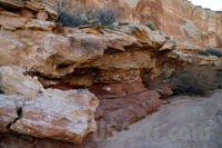 Der Weg führt entlang eines Washes, einem ausgetrockneten FLusslaufs. Der Boden ist sandig, was das Fortkommen anstrengend macht, hin und wieder verengt sich der Verlauf oder wir müssen einen kleinen Wasserfall hinauf klettern oder durch einen "Mini-Slotcanyon" durch kriechen. Alternativ gibt es meist einen Weg über die Böschung, um die Kletterei zu umgehen. Nach ca. 1,5 Meilen sollte eigentlich der Birthday Arch zu sehen sein, aber irgendwie ist weit und breit nichts von dem verflixten Ding zu sehen. Also gehen wir immer weiter bis wir im einen Tal an das Ende gelangen, ein Abschluss mit einem Wasserfall. Im anderen Tal finde ich einen kurzen, aber tief eingeschnittenen Slotcanyon, echt impossant aber noch immer kein Arch weit und breit. Unser Latein ist am Ende und wir kehren um - und da entdecken wir den Arch. Ich rase noch schnell den Sandhügel hinauf um noch ein paar Fotos zu schießen, meine Mitfahrer ziehen es vor, direkt weiter in Richtung Auto zu gehen.