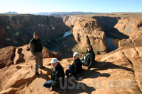Am Antelope Canyon erfahren wir, dass sie die Touristen nur noch in Touren durch den Canyon lassen - zum Schutz vor Kritzeleien in den Felswänden. Es gibt aber auch die Möglichkeit, einen 2 Stunden Pass für Fotographen mit Spiegelreflexkamera und Stativ zu bekommen. Leider konnte ich nur einen Pass für 2 Personen rausleihern, so dass ich mit Ingrid vorgegangen sind und Sina und Dieter auf die Tour gewartet haben. Der Eingang ist unscheinbar und wir zwängen unsere Bäuche in den Slotcanyon, doch dann steigen die ausgewaschenen Wände zig Meter hoch an. Die Sandsteinwände sind in unterschiedlichen Farbschichten und Formen ausgewaschen und sind ein echtes Spektakel. Wir sind noch nicht weit gekommen als wir doch von Sina und Dieter eingeholt weden, der Aufpasser hatte ein Einsehen und hat die Beiden doch so in den Canyon reingelassen. Und so hatten wir den Canyon ganz für uns vier alleine, die Gruppe hat uns mit lauten Geschrei erst beim Aussteigen eingeholt. Was für ein Glück für uns !