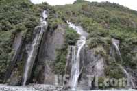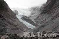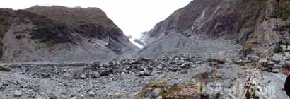 Vom Kiwi-Gehege waren wir erst entäuscht, liegt es doch im Halbdunkel und kein Kiwi ist weit und breit zu sehen. Beim zweiten Versuch haben wir dann einen entdeckt, der gemütlich marode Äste und Stämme nach fressbarem untersucht. Ist ganz nett anzusehen, insbesondere wenn man weiß, dass die armen Vögel fast ausgestorben sind. Leider sind sie auch sehr scheu und Fotos durften wir nicht machen. Kurz bevor wir den Fanz Josef Glacier erreichen wird die Landschaft wieder Hügelig und wir sind wieder vom Regenwald mit seinen Büschen, Bäumen und den vielen Farnen umgeben. Franz Josef Glacier besteht aus ein paar Häusern, die meisten sind Shops, Restaurants oder Buchungsstelen für Helicopter Flüge, Rafting Touren oder sonstigen touristischen Angeboten. Eigentlich wollten wir einen Rundflug über den Gletscher und um den Mt Cook herum machen, aber leider ist es bewölkt und wir verzichten darauf, viel Geld zu zahlen und im Wolkennebel zu stochern. Wir fahren den Weg zum Franz Josef Glacier hinter und machen uns auf den Pfad zum Gletscherrand. Auf schön angelegtem Weg erreichen wir das Geröllfeld und Fluss, in den sich der Glätscher entwässert. Von hier erhaschen wir den ersten Blick auf den Gletscher, der sich faszinierend mit seinen Eismassen bis in den Regenwald hinein schiebt. Über das Geröll führt ein Pfad bis fast hin zum Gletscher, rechts und links Regenwald mit teilweise schroffen Klippen und hohen, senkrechten Waserfällen. Ein schöner kleiner Walk ...