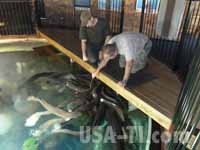 14. Tag: Von Hokitika über Franz Josef Glacier nach Haast Wir verlassen unser Motel um kurz nach 9:00 Uhr und fahren zum National Kiwi Center in der Stadtmitte. Neben Kiwis gibt es dort auch verschiedene Aquarienfische zu sehen und als weiteres Highlight die neuseeländischen Riesenaale. Die Fische sind anschauend und ansprechend in ihren kleinen Aquarien ausgestele, sind aber nichts aussergewöhnliches. 2riesige Glastanks beherrschen den Hauptraum: Im einen sind lauter kleine Fische, die wahrscheinlich auch als Futter genutzt werden. Der zweite Tank ist die Heimat von den Riesenallen, die alle zwischen 85 und 120 Jahre alt sind, teilweise weit über 1,5 Meter lang einen Durchmesser von mehr als 15cm haben. Um 10:00 Uhr sind wir bei der Fütterung dabei und nehmen da den aktiven Part ein, den Rießen in kleinen Portionen Rindergedärme und ähnliches zu geben.