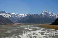 Der Mt Cook erhebt sich am Ende des Lake Pukaki und der anschließenden, von Gletschern frei geräumten Talsole. Der lake Pukaki erstreckt sich über zig Kilometer in einem hellen, seichten blau, das allerdings bei näherer Betrachtung nicht über kristalklares Wasser und dem entsprechenden Untergrund herrührt sondern aus im Wasser gelösten Sedimenten. Das Waser erscheint wie milchig, nur eben in dem hellen blauen Farbton.
