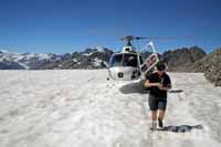 Am Ende des Lakes besteigen wir wieder mal einen Helicopter und und machen einen Rundflug über die Hochalpine Bergwelt rund um den Mt Cook, vorbei an dem Franz Josef und dem Fox Glacier mit eingeschlossener Landung auf einem Schneefeld oben auf knapp 3000m Höhe.Vorsichtshalber haben wir mal Jacken zu unseren Shorts eingepackt, doch dank der starken, wärmenden Sonne haben wir diese dann im Helicopter gelassen und genießen die Aussicht auf die Bergweltin sommerlichem Outfit. Der Rundfug war einfach phantastisch und eröffnet uns Ein- und Ausblicke, die ansonsten den Bergsteigern vorbehalten sind - ein absolutes Erlebnis.