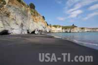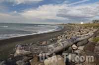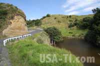 Wir beziehen unser Zimmer und machen uns auf einem Spazierweg entlang eines Baches zum Strand. Der Strand ist schwarz und wieder einmal liegt am oberen Rand Schwemmholz herum, sieht faszinierend aus. Das Wasser ist uns durchaus zu kalt, dennoch sehen wir immer wieder Leute baden - wenn man es gewohnt ist ... Entlang des Strands führt ein schön angelegter Strandweg und wir laufen noch etwas entlang. 20. Tag: Von New Plymouth nach Te Puiti Wir schlafen mal wieder aus, frühstücken die Avocados und Äpfel, die wir gestern an einem Stand gekauft hatten, und halten noch einmal beim Starbucks. In den Motels gibt es immer nur Tee oder löslichen Kaffee, wo ich dann doch den Tee bevorzuge. Und Starbucks sind recht selten gesäht, so dass wir das hier ausnutzen. Die Landschaft zieht sch wieder sehr reizvoll dahin. Wir biegen noch ab zu den White Rocks, einem Küstenabschnitt mit einer Steilküste aus hellem Gestein, das sich über dem Meer und einem schwarzen Strand erhebt. Bereits die Hinfahrt war schon interessant: Von der Hauptstraße ist eine normal große Straße abgezweigt, mit 2 Fahrspuren in jede Richtung. Während der ca. 10 km bis zu den White Rocks haben wir verschiedene Bauerhöfe passiert, und nach jedem Bauernhof ist die Straße ein kleines bischen schmaler geworden - in in einem Energieflussdiagramm. Bis wir die White Rocks erreicht haben ist es noch eine schmale Fahrspur mit gelegentlichen Ausweichstellen. Zum Glück kam vorher kein Hof mehr ...